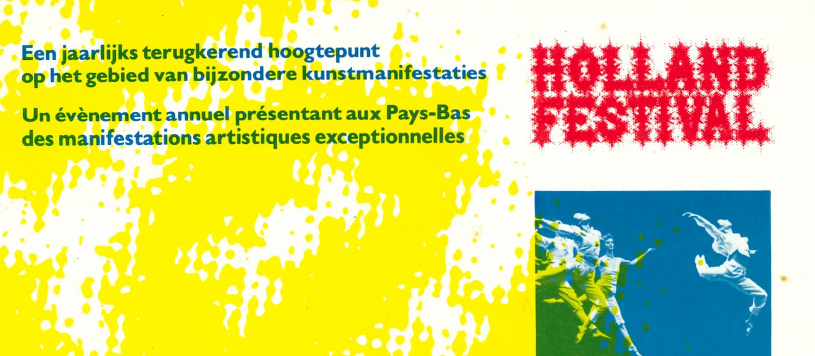 Welcome to the Holland Festival archive! The history of our festival dates back to 1947. Through the programs of each festival edition we aim to tell this history here. Currently our archive has been digitised from 1990 onwards, more history is to follow soon. Sadly some information is only available in Dutch but we aim to be as bilingual as possible. For additions or tips send an email to [email protected].