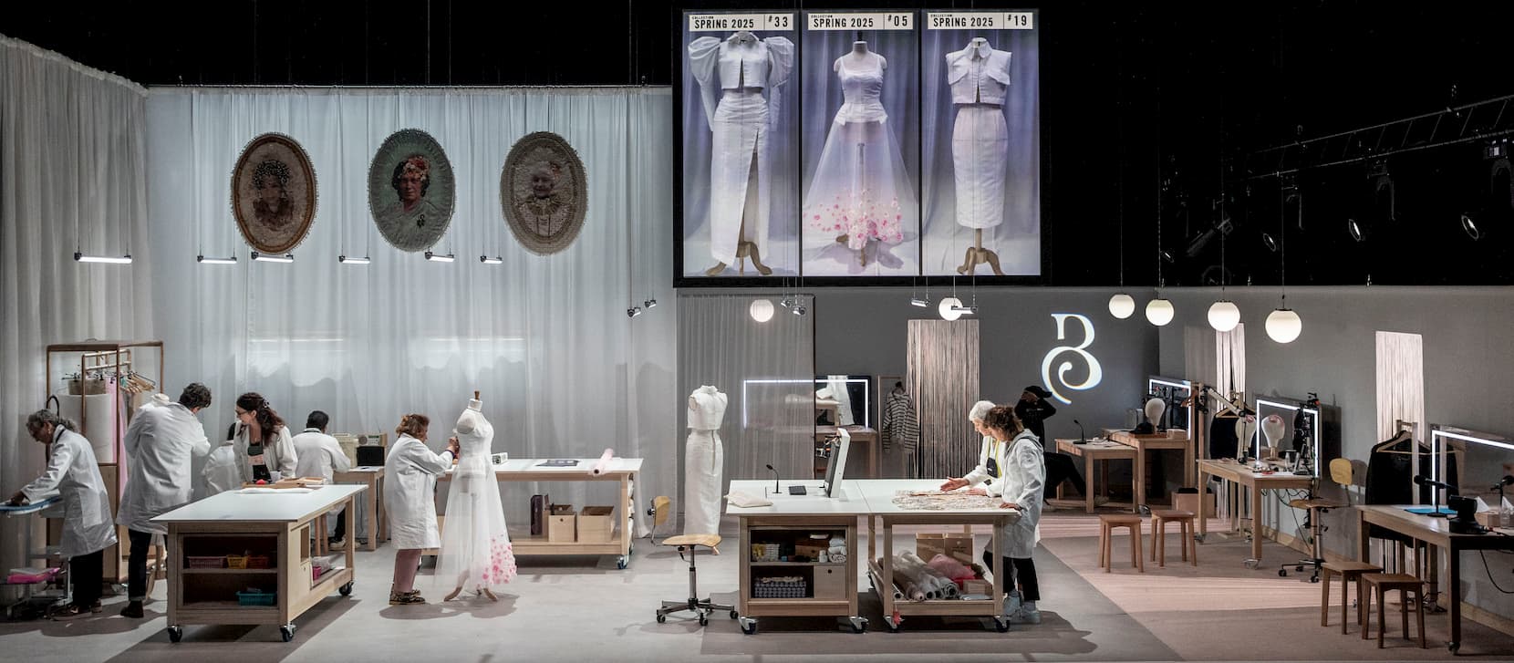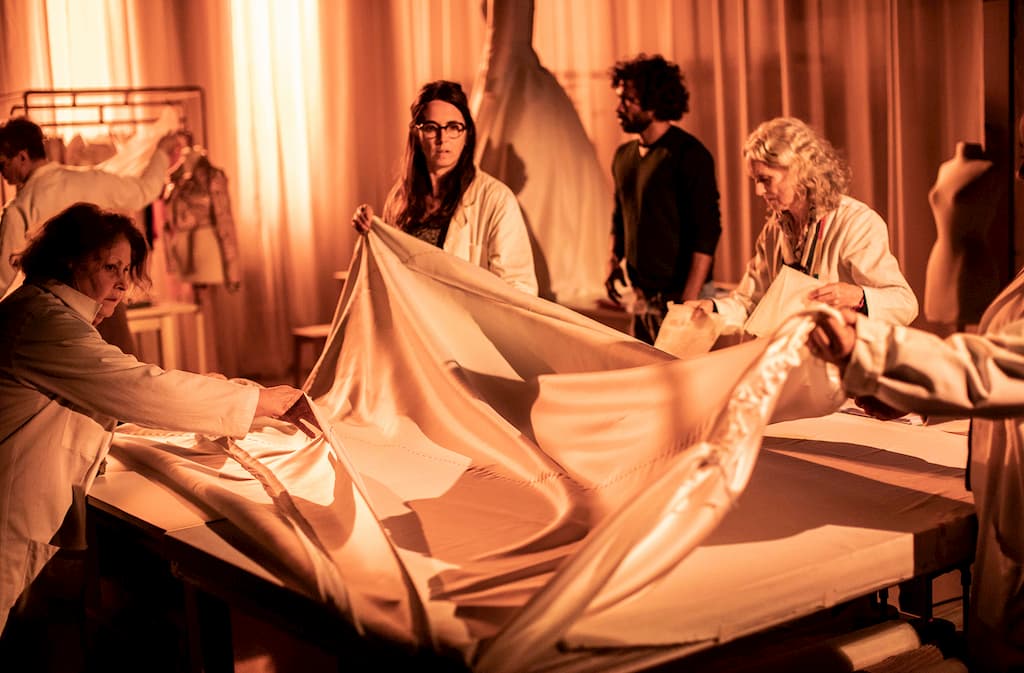 De jurk zelf staat symbool voor zichtbaarheid: wereldberoemd op het lichaam van een prinses, terwijl de makers meestal onzichtbaar blijven. Met een open scenografie en dynamische videobeelden (details van het schitterende naaiwerk komen letterlijk in beeld) die gelijktijdig de drie ateliers tonen, ontvouwt zich een razendspannende voorstelling die kijkt als een serie.